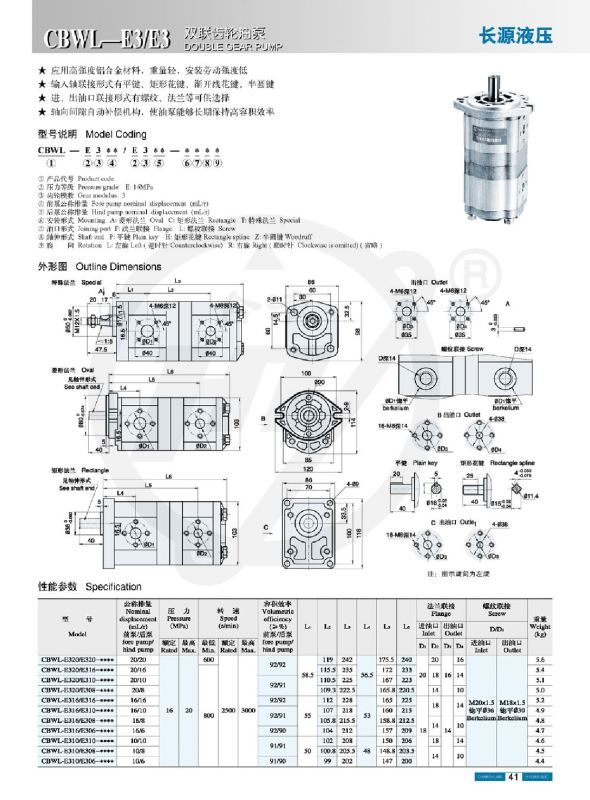 cbwl-e3 系列双联齿轮泵壳体采用高强度铝合金材料,内部结构采用浮动侧板,自动补偿侧隙等多项先进技术。它具有压力高,噪音低,维修方便,工作可靠,使用寿命长等特点。适用于起重机、石油钻机、压路机等工程机械。
